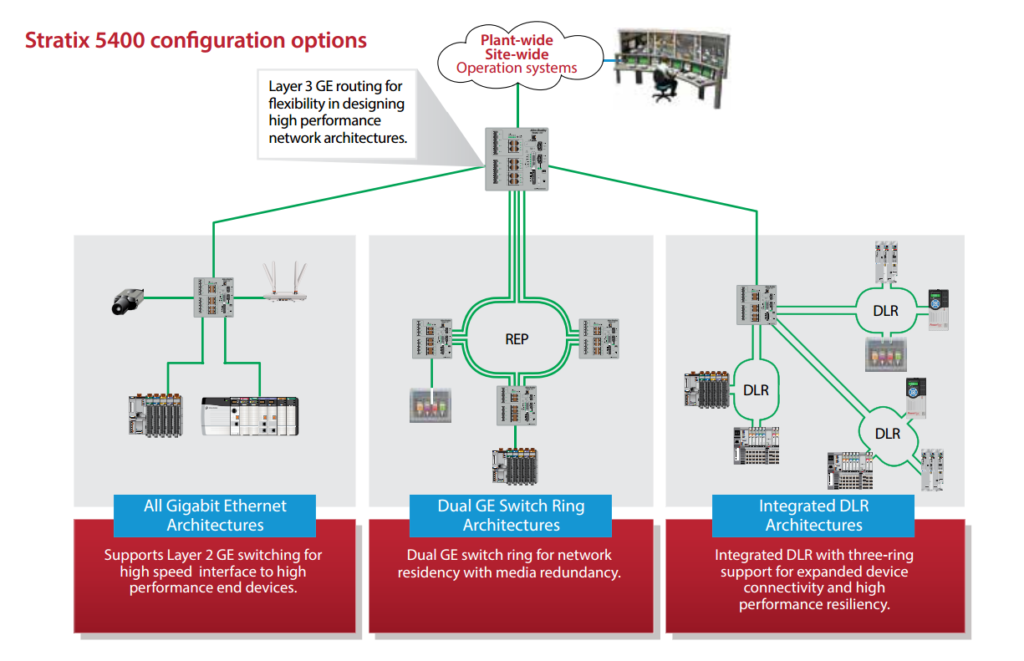 Промышленные управляемые коммутаторы Stratix 5400 поддерживают как коммутацию (Layer 2), так и маршрутизацию (Layer 3), обладая также дополнительными гигабитными PoE и гигабитными оптоволоконными портами. Эти коммутаторы позволяют увеличить пропускную способность сети, не теряя гибкости сетевой архитектуры.
