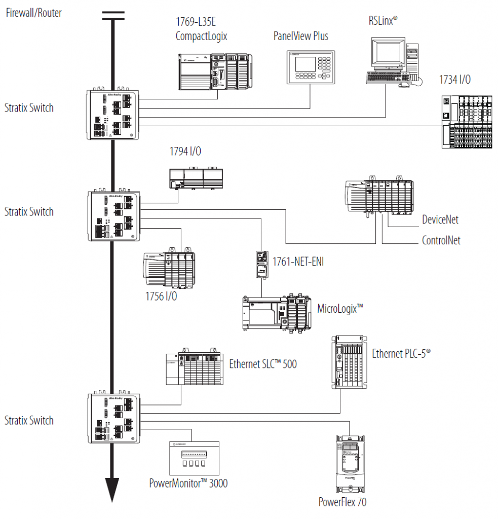 Для подключения контроллера ControlLogix к промышленным сетям доступны коммуникационные модули. Несколько коммуникационных модулей в одном шасси позволяют маршрутизировать данные различных сетей. Возможна перетрансляция сообщений до восьми раз (расстояние в четыре шасси). Установка контроллера в шасси при этом не требуется.